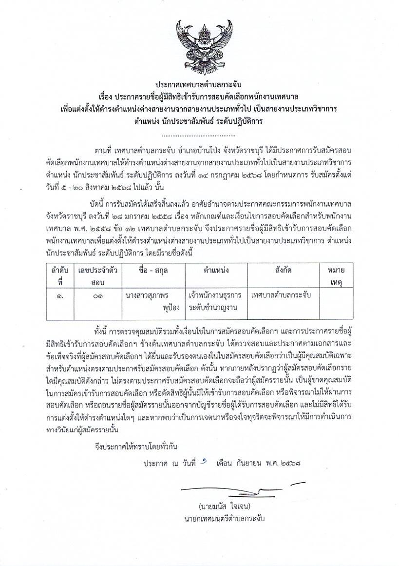 ประกาศรายชื่อผู้มีสิทธิเข้ารับการสอบคัดเลือกพนักงานเทศบาลเพื่อแต่งตั้งให้ดำรงตำแหน่งต่างสายงานจากสายงานประเภททั่วไป เป็นสายงานประเภทวิชาการ ตำแหน่ง นักประชาสัมพันธ์ ระดับปฏิบัติการ