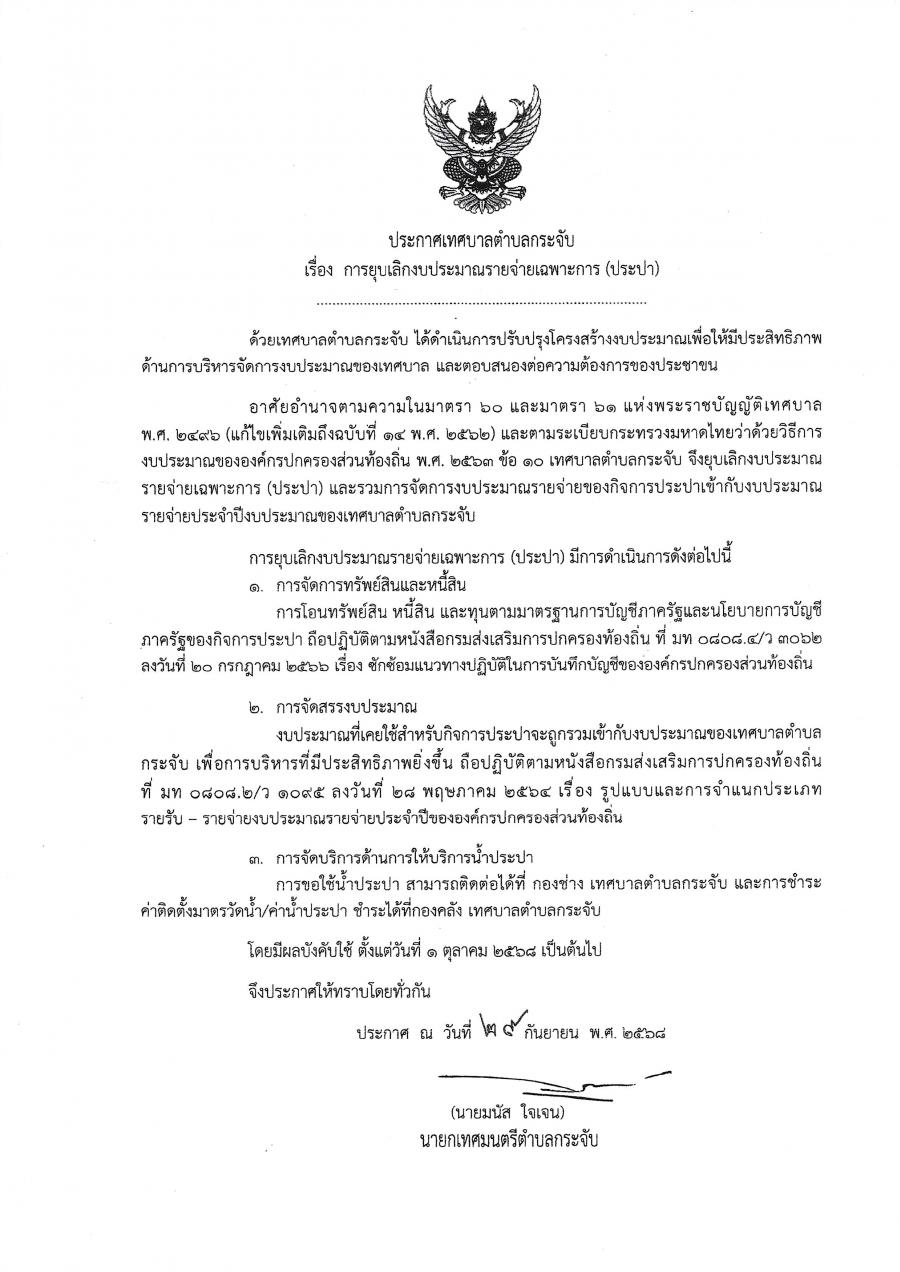 ประกาศการยุบเลิกงบประมาณรายจ่ายเฉพาะการ (ประปา)