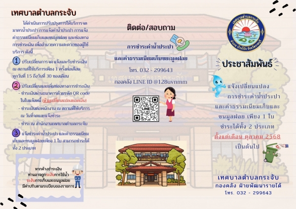 ขอประชาสัมพันธ์แจ้งเปลี่ยนแปลงชำระค่าน้ำประปาและค่าธรรมเก็บและขยมูลธรรมเนียมฝอย
