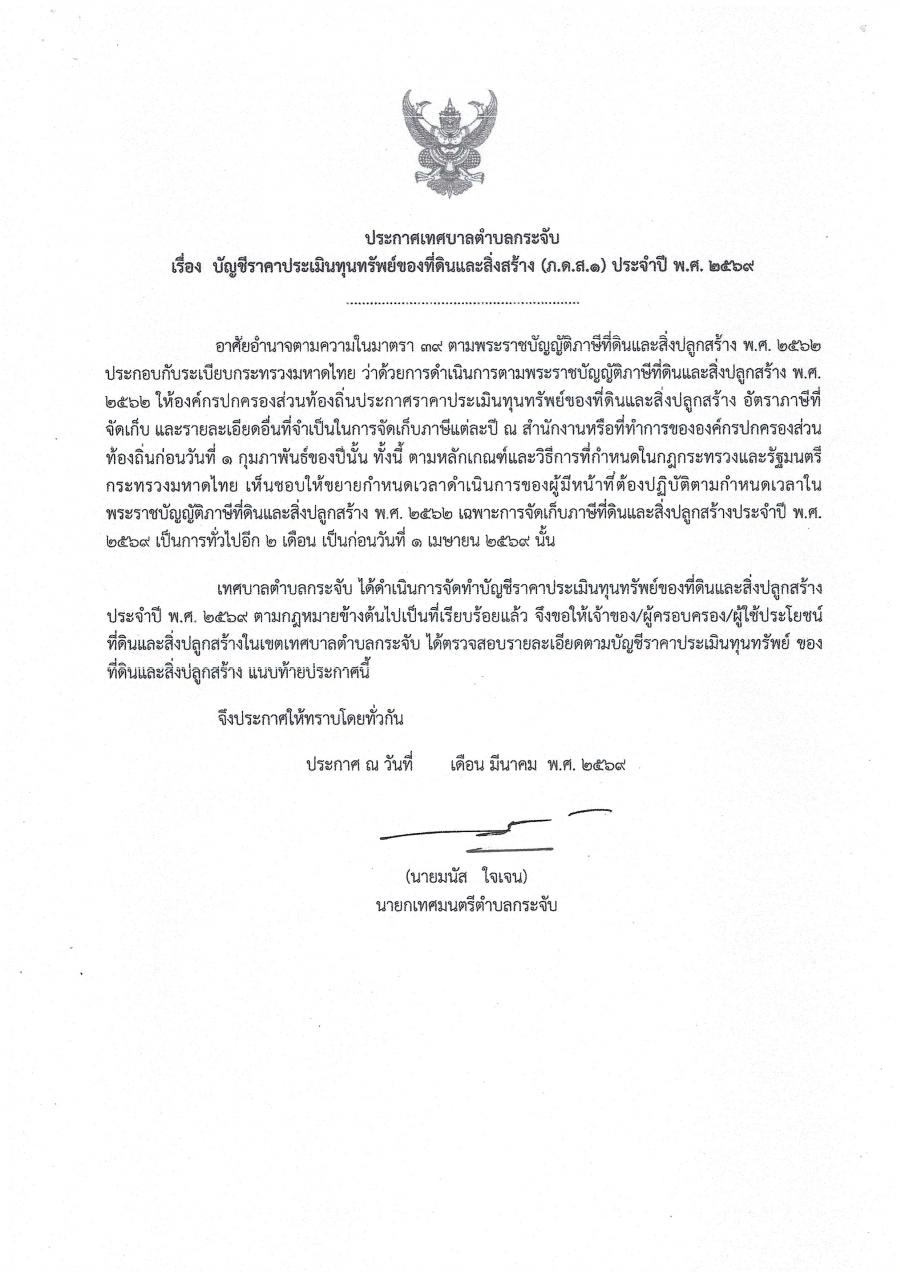 ประกาศบัญชีราคาประเมินทุนทรัพย์ของที่ดินและสิ่งปลูกสร้าง (ภ.ด.ส.1) ปี 2569